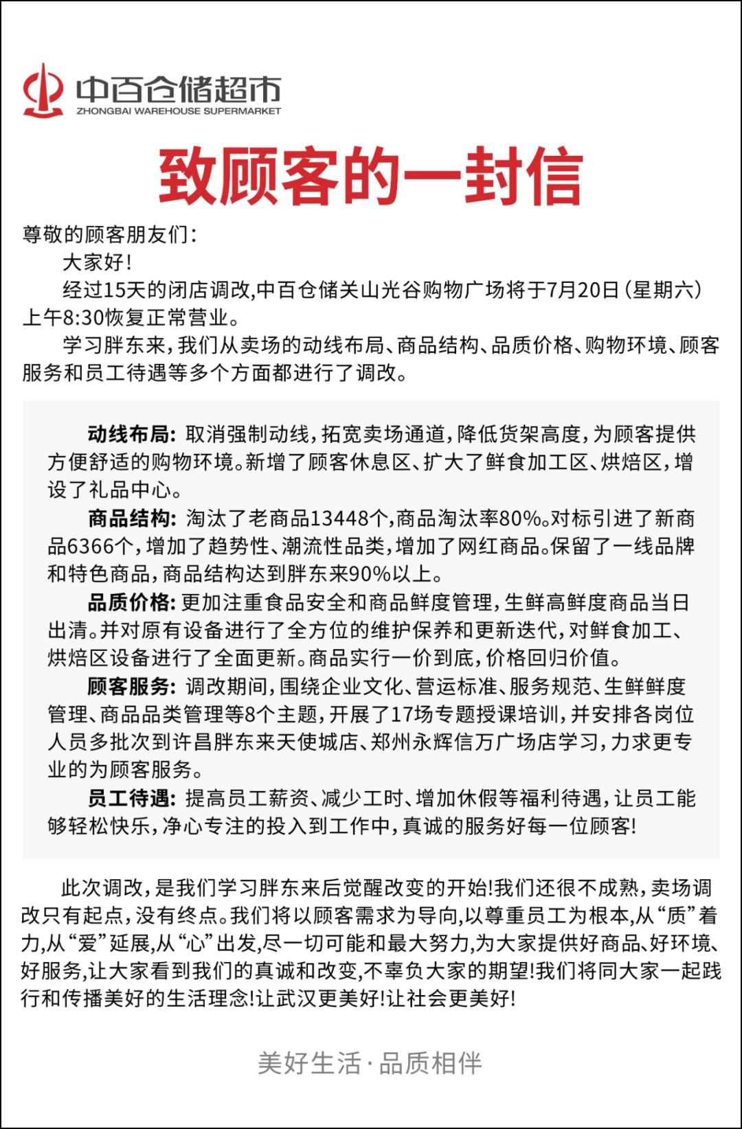 中百仓储超市于7月17日发布顾客信,宣告其胖东来式调改的首店——关山光谷店即将开业。