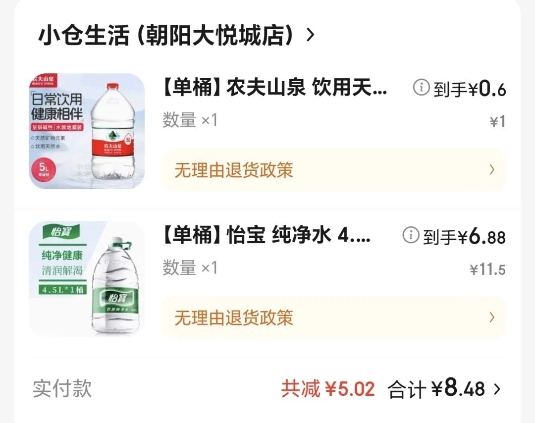 对用户来说,凑平台的极致满减一直是复杂的数学题,有时是伪命题。但经测试,在京东秒送,以北京小仓超市为例,用户实付8.48元能够买到规格5L的农夫山泉,和4.5L的怡宝纯净水。