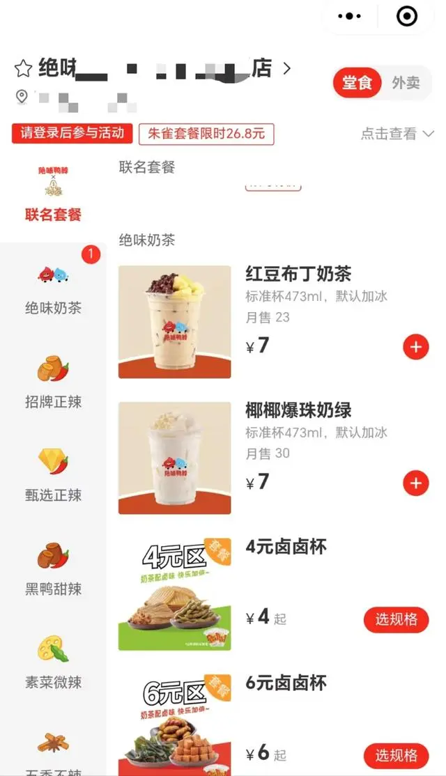红星资本局查询绝味鸭脖官方点单小程序,发现大部分门店还未上架奶茶产品。在上架的一家店铺内,“绝味奶茶”项目被放在了第二栏,有两款产品,分别为红豆布丁奶茶和椰椰爆珠奶绿,售价7元。小程序数据显示,该店铺两款月售分别为23杯、30杯,后者比该店小程序的招牌鸭锁骨销量数据高。