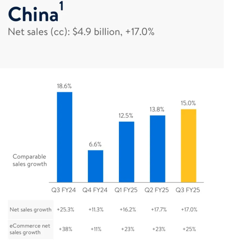 第三财季,沃尔玛中国净销售额达49亿美元(约合355亿元)、同比增长17.0%,增长动力主要来自山姆会员商店和电商业务,同时山姆会员商店和沃尔玛大卖场业态的线下客流量均实现正增长。