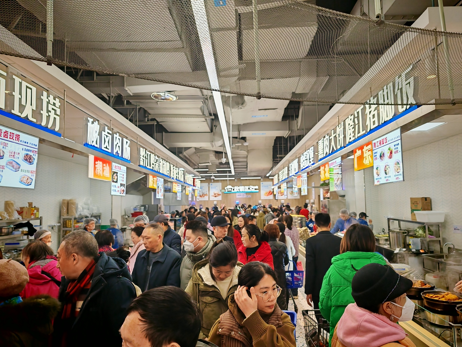 在盒马鲜生世茂广场店,不少市民围在鲜切肉铺旁,现场的服务员正在按照消费者意愿,现场分割猪肉、羊肉、牛肉;在熟食一条街,汇集全国各地美食,岭南牛杂、隆江猪脚饭、淮南牛肉汤、熏肉大饼等各具特色。逛完店、买完菜,市民张女士还不忘在门口顺便选购一束鲜花,她表示,“澳洲腊梅、银柳、冬青、小香松……品类太全了。美食满足了口腹之欲,鲜花则能点缀一天的好心情。”