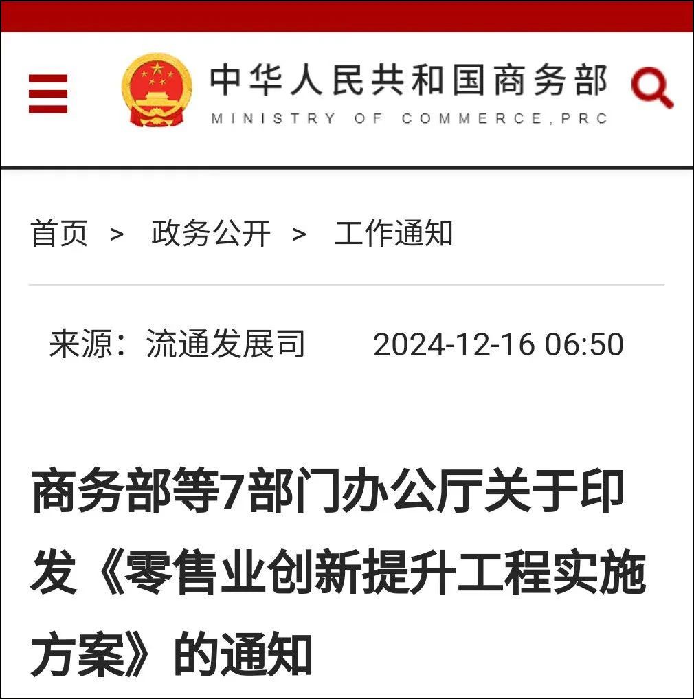 龙商网消息: 近日,商务部、住房城乡建设部等7部门联合印发《零售业创新提升工程实施方案》(以下简称《方案》)。 聚焦百货店、购物中心、超市、社区商业中心等零售商业设施改造提升和创新转型,《方案》提出,力争到2029年,初步形成供给丰富、布局均...