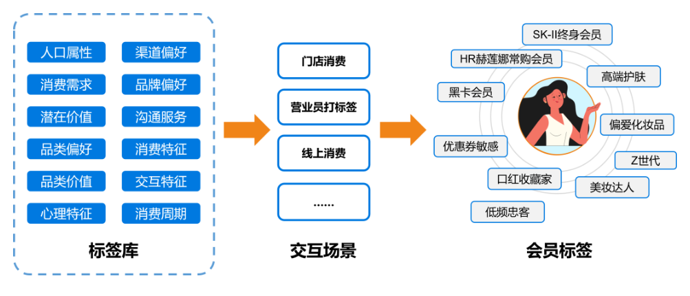 高端化妆品自营的管理,可以让企业在最细化的颗粒度中洞察顾客诉求,比如顾客的商品喜好、购买习惯、客单等等,结合会员的权益玩法、精准营销等能够有效地拉升客群粘性。比如:“顾客”在3个月内购买了SK-II神仙水2次,我们就可以获取到顾客的商品喜好、商品使用习惯等,为其打上“高端护肤”的标签。同时,如果购买节点都在该商品做促销活动的档期中,就可以将其锁定在“优惠券敏感”的标签中,结合标签指标中的性别、年龄、消费时间、消费门店、支付方式等属性,构建起基于用户社会属性、生活习惯和消费行为等聚合而成的用户画像。
