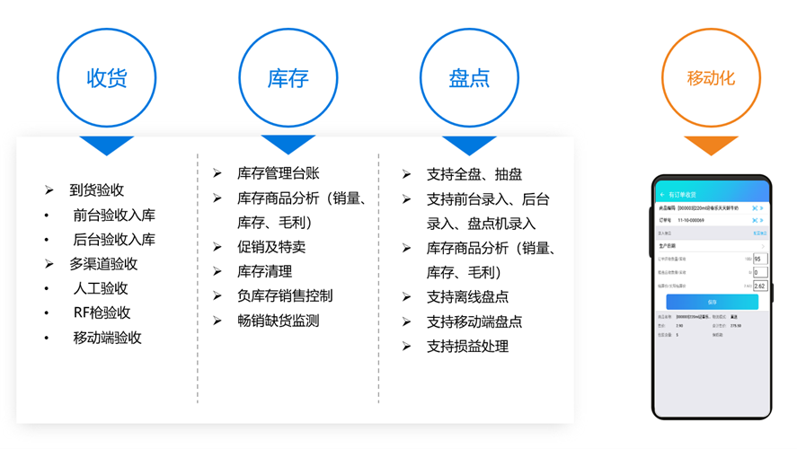 高端化妆品的自营管理中由于其标准化程度高、商品相对聚焦。企业在自营管理模式中可以简化很多业务环节的工作,比如:采购环节、订货环节等等。在实际业务中,商品抵达门店后,导购即可通过手机端完成商品验收入库的动作,在系统中将会详细地统计不同款式、不同颜色化妆品的详细数量,方便企业进行管理。在拣货出库、盘点等各业务环节,也可以结合手机端进行管理,有效简化自营单品管理的同时,提升工作效率。