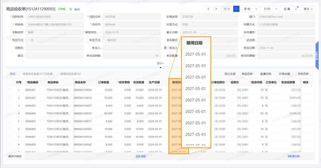 保质期管理是高端化妆品自营业务中极其重要的一个环节,以往手动记录的模式在通过数字化升级后也有了更为高效的管控方式。一般高端化妆品会在商品上标注其有效期,在商品的验收环节中通过手机端可以直接录入商品的批号以及有效期,系统中将会通过商品编码+批号的方式进行管理,这样就可以清晰地了解到同一SKU下商品不同有效期的情况。