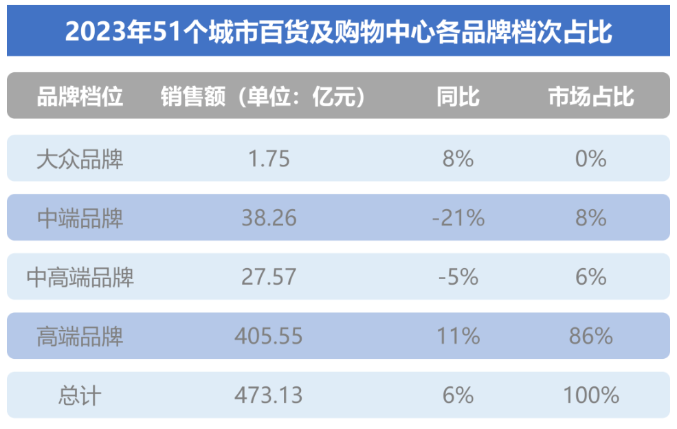 一直以来,化妆品品类在百货、购物中心中都有着极高的占比,是线下流量与销售的重要增长引擎之一。然而经数据显示,过去的5年中全国51个城市的百货、购物中心,化妆品柜台总数减少了接近6000个,其中2023年就减少了1863个品牌专柜。在如此巨大的落差下,销售额却逆势增长了6%(473亿元)。尼尔森数据显示全国51个城市百货、购物中心化妆品销售额中只有高端品牌实现销售额增长,且市场占比达到了惊人的86%,远超大众品牌、中端品牌、中高端品牌三类品牌档次的总和。这意味着,高端化妆品品牌的线下“主战场”,在2023年焕发出新的生机。