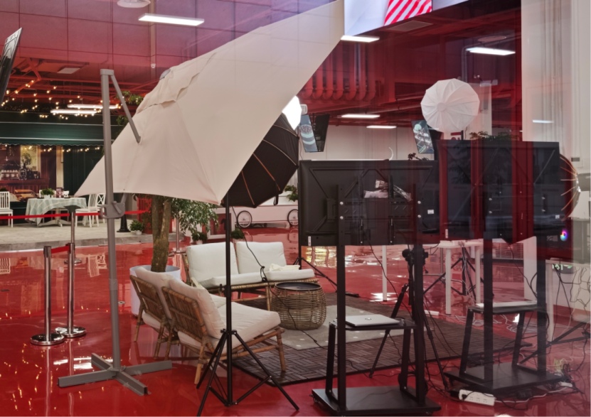 整个现场就像一个巨大的“线上直播MCN基地”,场景搭建、功能设置甚至灯光设置等都是为了让线上直播效果更好,增加“直播滤镜”效果。