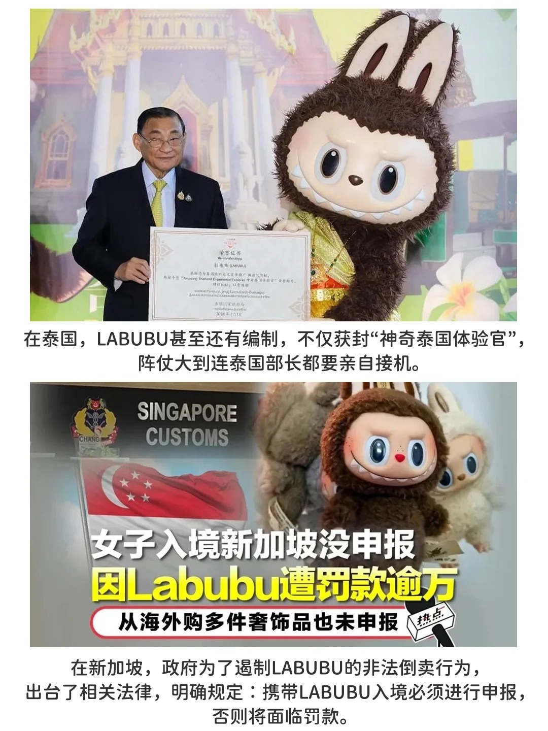 在过去的一年里,她被泰国出生的女团偶像Lisa疯狂扫货,被泰国公主思蕊梵娜瓦瑞挂在爱马仕上。甚至,泰国官方也在为这一IP的爆火添砖加瓦。去年,身穿泰国服饰的LABUBU人偶到达泰国机场,泰国旅游与体育部部长瑟姆萨·蓬帕尼的亲自前来接机,并为其授予“神奇泰国体验官”的称号。