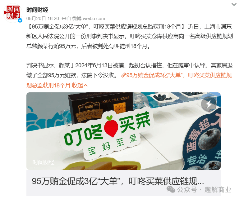 零售是弯腰捡钢镚的苦生意,需要从细枝末节处优化成本、提升效率。这其中也包括内部人员的管理。最近,叮咚买菜供应链规划总监颜某,因受供应商贿赂95万元被判处有期徒刑。2022年,叮咚买菜蔬菜、水产部的相关采购负责人也都曾因受贿被法院宣判。