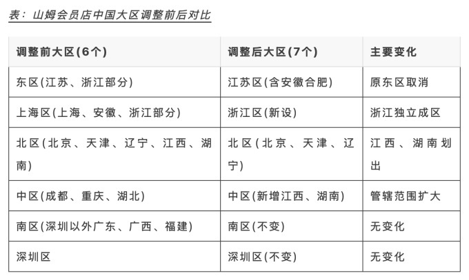 5月30日,多家权威媒体报道山姆会员店开启新一轮大区组织调整,将原有6个大区重组为7个,新设江苏、浙江两大区,同时取消原东区建制。