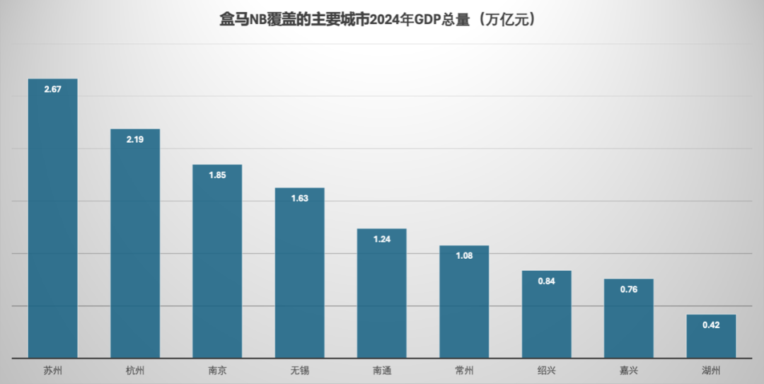 除上海、苏州、无锡之外,盒马NB分别布局了四座浙江省地级市(杭州、嘉兴、绍兴、湖州)和三座江苏省地级市(常州、南京、南通);其中三座江苏城市2024年GDP均突破万亿元,四座浙江省地级市中,虽仅有杭州突破万亿元,但绍兴、嘉兴等因为毗邻上海,供应链和品牌影响力能覆盖到,嘉兴更是盒马NB出上海扩张的第一城。