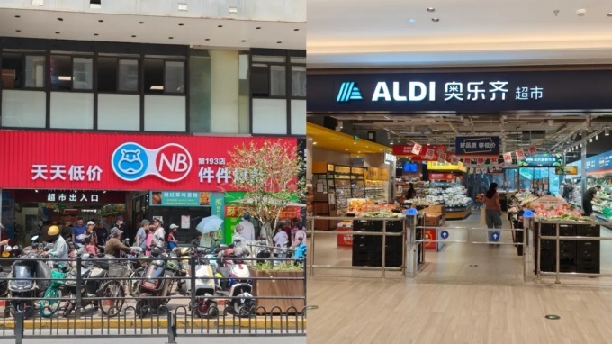 图:左为盒马NB四川北路店、右为奥乐齐苏河湾万象天地店