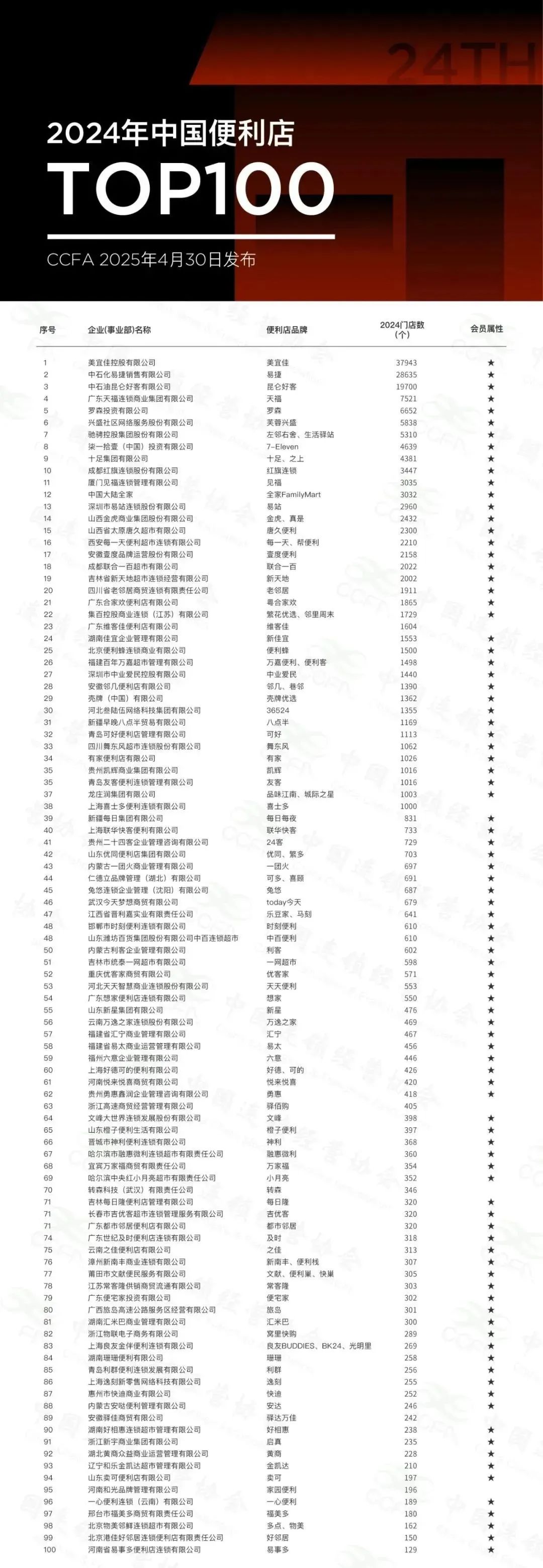 2024年中国便利店TOP100 图源:CCFA