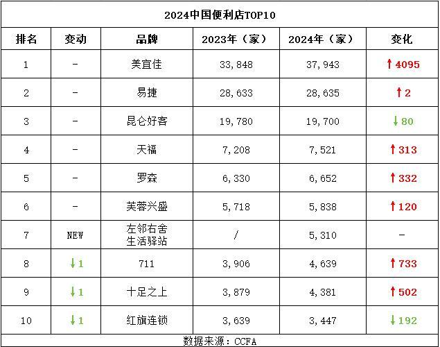左邻右舍和生活驿站上榜,7-11(4639家)、十足和之上(4381家)、红旗连锁(3447家)各自下降一位,分列第八、九、十。