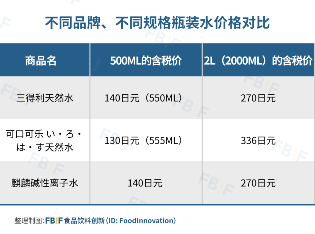 在罗森便利店,南阿尔卑斯天然水2L装的售价为含税100日元,1L的售价为含税176日元,550mL的售价为含税108日元[1];而在7-Eleven便利店,三得利天然水2L的价格为112日元,550mL为108日元,规格翻4倍,只贵了4日元[2];在便利店,2L瓶装水价格为90+日元,550mL瓶装水价格100+日元的情况非常普遍。[3]