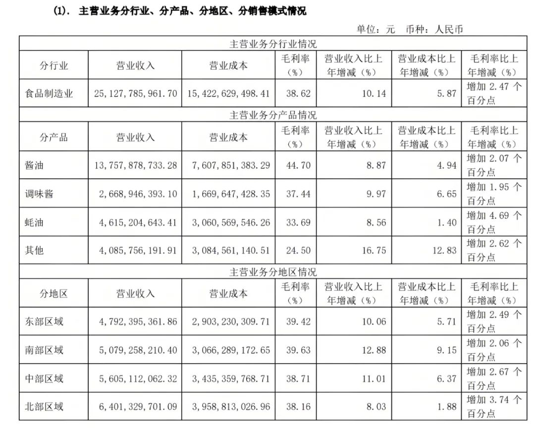 财中社数据显示,2024年,海天酱油吨价同比下降2.5%至5363.74元/吨,根据海天2024年报显示,2024年酱油销量同比增长11.6%至256.5万吨,酱油业务营收的同比增长为8.9%,这说明海天酱油的价格在下降。其他企业也出现了类似的情况,如中炬高新2024年酱油产品价格降了超300元/吨,千禾味业降了超200元/吨。
