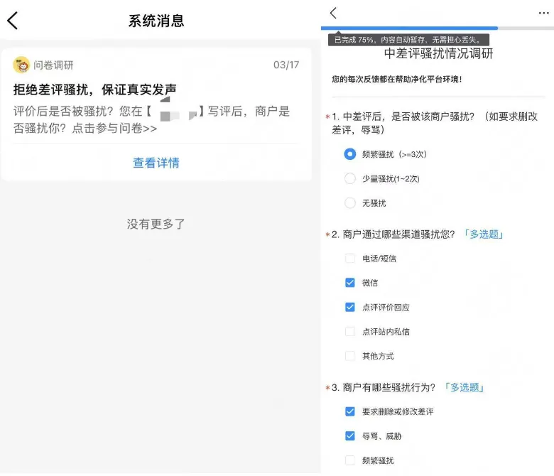 除此之外,在此次栏目改版升级前,美团还针对消费者吃饭时被要好评、写真实差评吐槽被骚扰的问题,推出了全民监督机制,开启一键投诉功能。