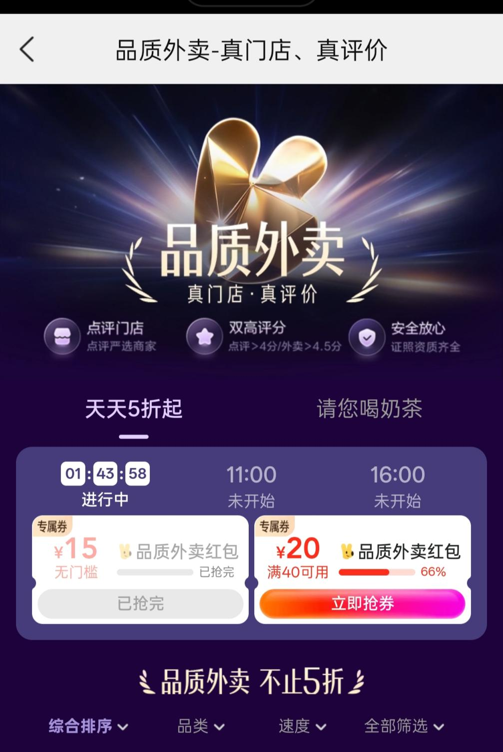 具体而言,“品质外卖”入驻商家均为大众点评严选商家,点评>4分且外卖>4.5分,证照资质齐全,主打“真门店,真评价”。