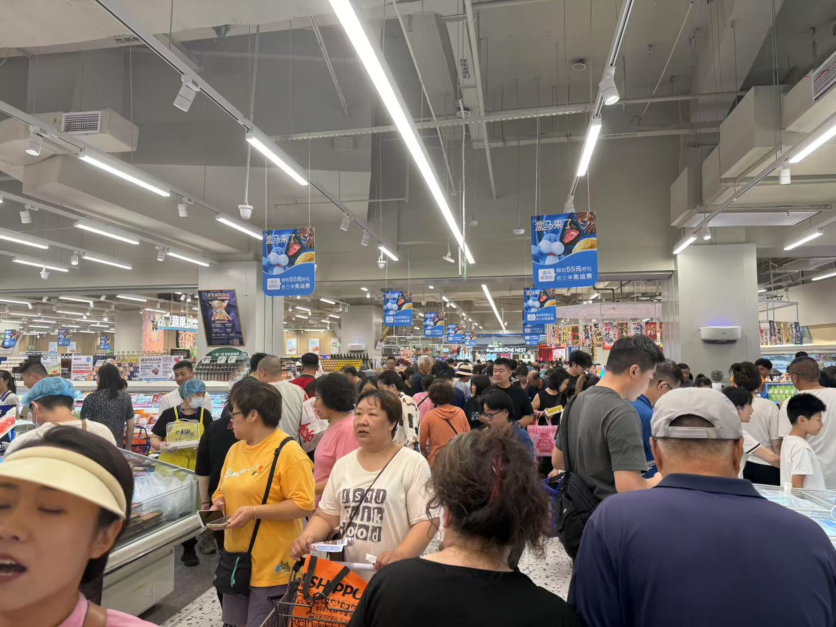 “第一次见,排队排到了地铁口。”6月28日下午,王女士一家来到盒马鲜生购物,出门前打开导航,发现大悦城周边全是红色,于是决定地铁前往,“地铁上遇到不少自带手提袋的,一看就是去盒马。”
