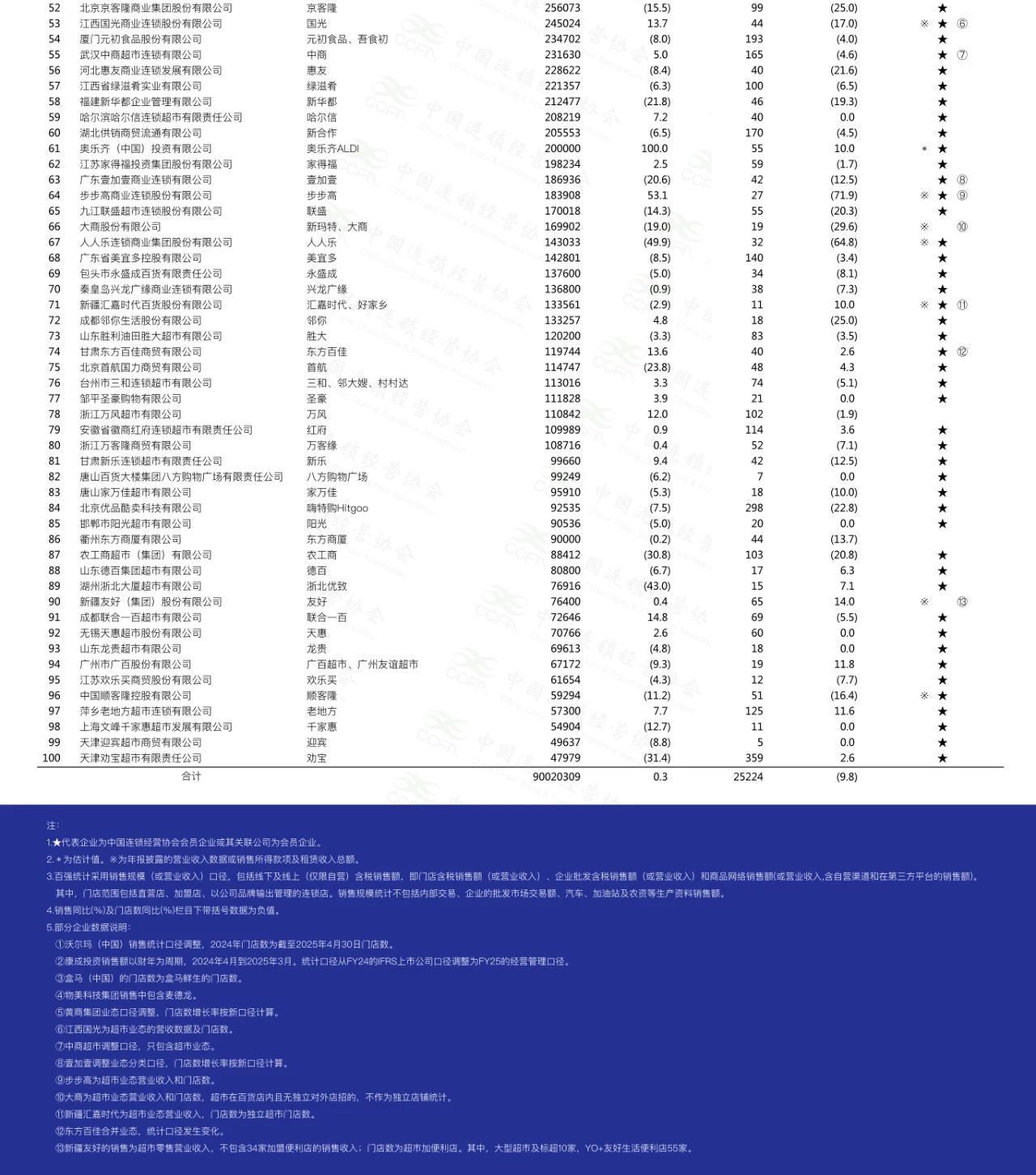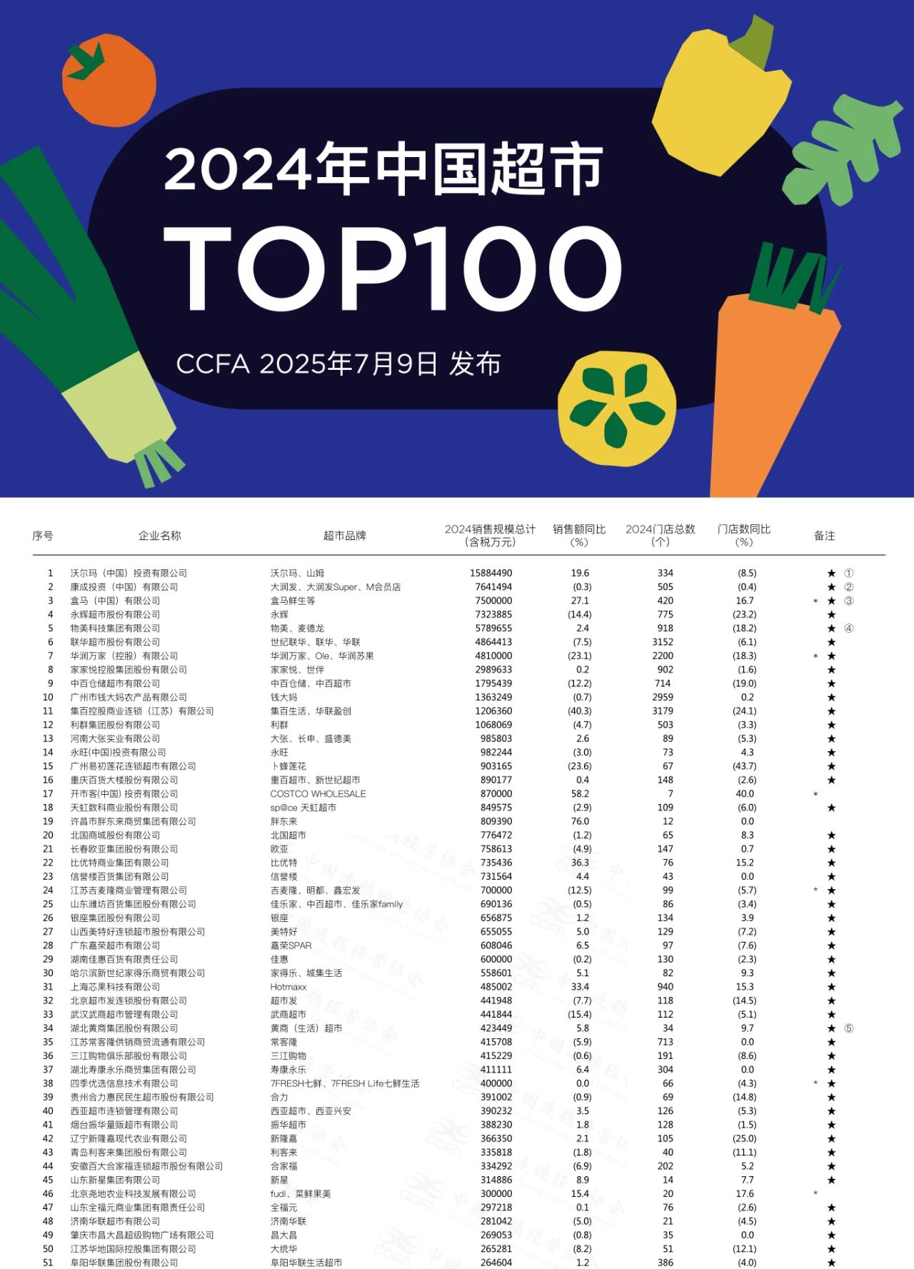 龙商网消息:2025年7月9日,中国连锁经营协会(CCFA)公布“2024年中国超市Top100”榜单。(见附表)