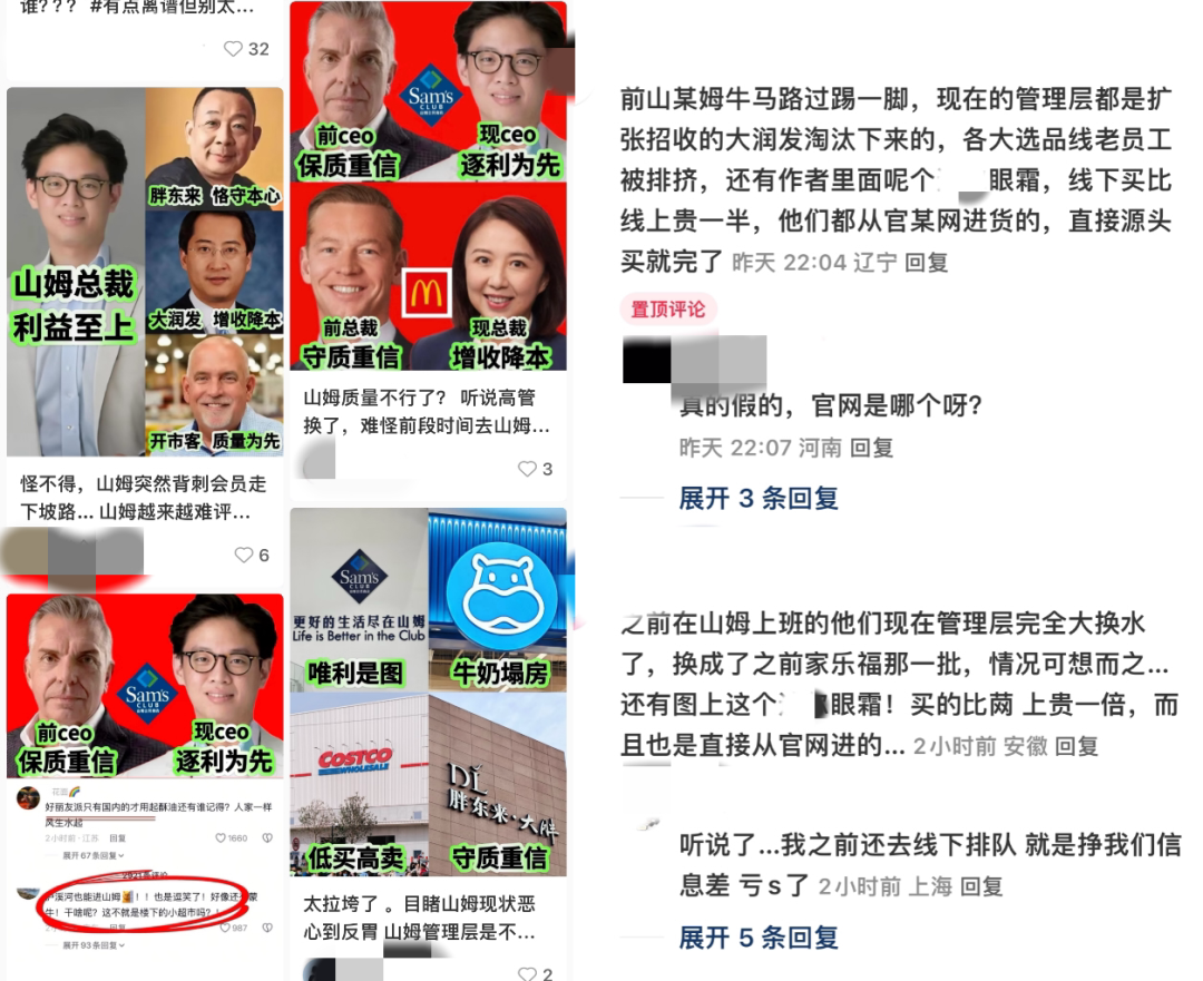 山姆舆情愈演愈烈,但各平台山姆的相关帖子却稍显诡异,除了真情实感的消费者吐槽帖外,有一些帖子无论是话术还是图片都几乎一模一样,其中提到的“山姆CEO变更为中国人引起品质下滑”,目前并无实证。