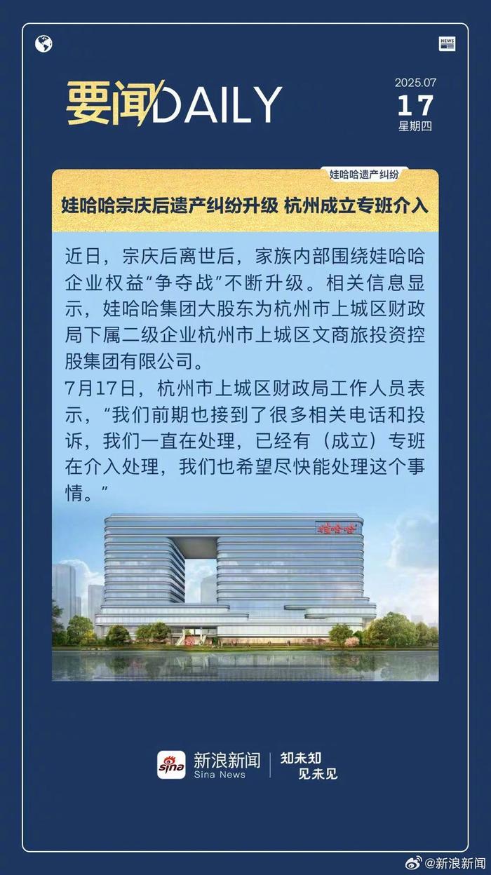 近日,宗庆后离世后,家族内部围绕娃哈哈企业权益争夺战不断升级。相关信息显示,娃哈哈集团大股东为杭州市上城区财政局下属二级企业杭州市上城区文商旅投资控股集团有限公司。7月17日,杭州市上城区财政局工作人员表示,我们前期也接到了很多相关电话和投诉...