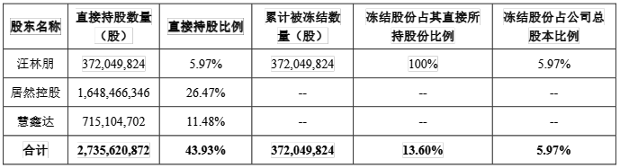 4月18日,居然智家发布《关于公司实际控制人所持公司股份被司法冻结的公告》称,截至本公告披露日,汪林朋为公司实际控制人,公司控股股东北京居然之家投资控股集团有限公司(下称“居然控股”)与霍尔果斯慧鑫达建材有限公司(下称“慧鑫达”)与汪林朋为一致行动人,居然控股、慧鑫达、汪林朋所持公司股份累计被冻结3.72亿股。