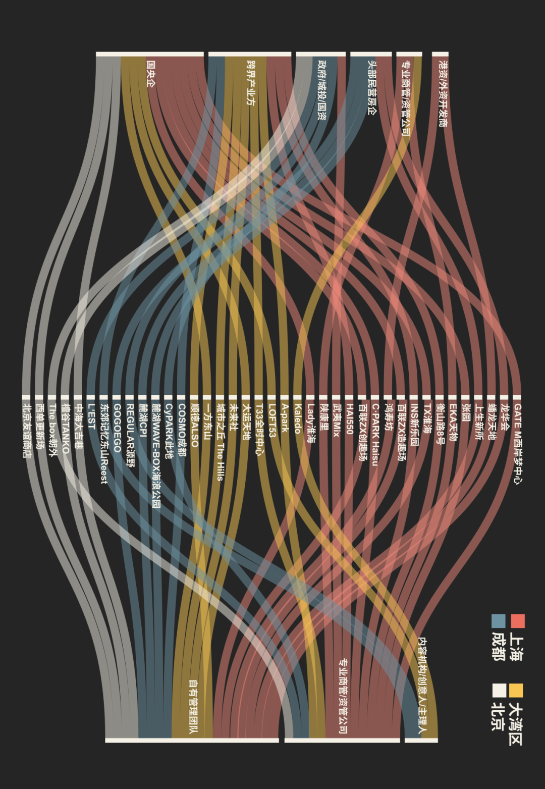 通过将上述四个城市/区域的非标项目,汇总在一张图表上进行观察,可以更明显看出,不同城市的项目确实在主导企业背景、改造运营逻辑、业态品牌组合上,有着明显的差异。