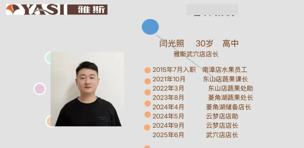 闫光照是雅斯年轻管理者中的典型代表。这位从理货员升上来的95后,入职初期在门店各部门辗转数月,深入学习包括水果、蔬菜在内的各项基础实操技艺。经过8年时间、7次晋升,他凭借出色的专业技术和领导能力,升任主力门店云梦店店长,大广场店武穴店店长。晋升路径包括蔬果课长、处长,再到储备店长、店助,最快的一次晋升只用了1个月。在不久的未来将向大区总方向发展。