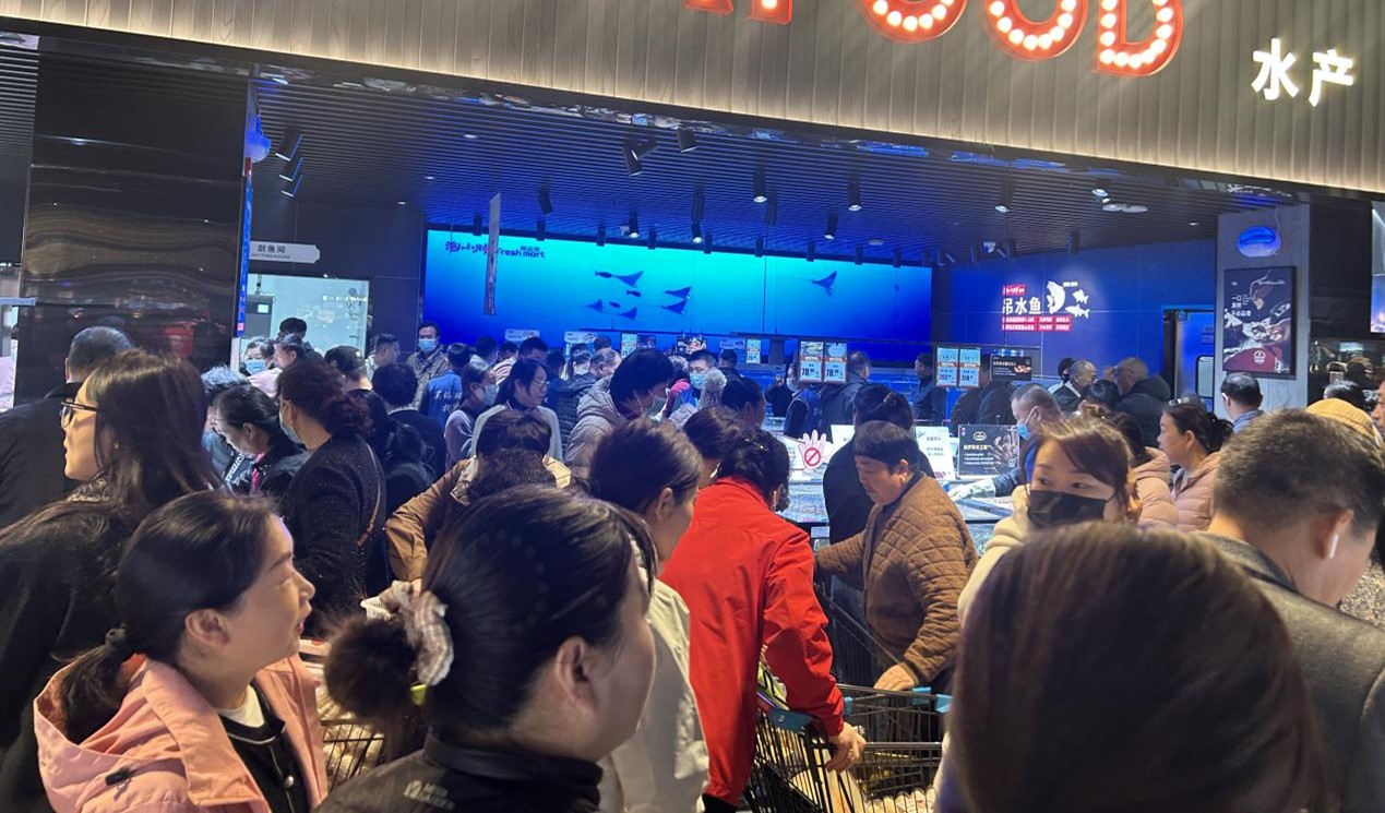 开业一小时后,店内客流迅速攀升,生鲜、熟食及烘焙区尤为火爆。熟食区明档现场制作炸物、烤肠、关东煮等,即买即食,烟火气十足,多个档口前排起长队。部分商品立即出现热销盛况:4元每根的烤肠深受年轻人喜爱,需持续补货,水产区因人流量大一度通行困难,其中河虾、贝类最受欢迎。