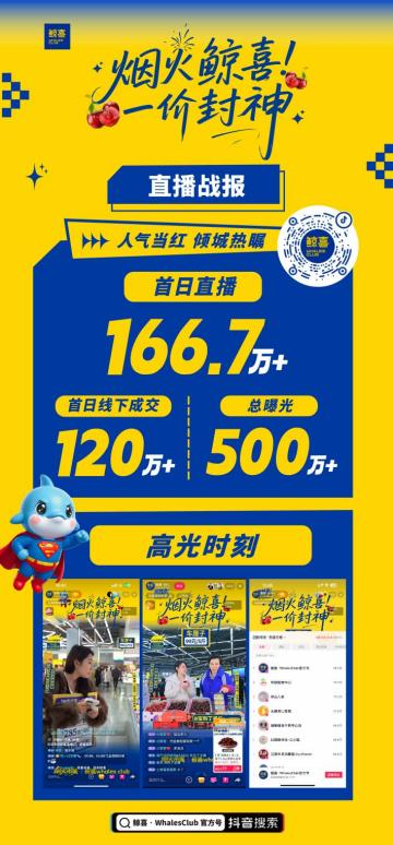 峰值突破 120 万;抖音平台“鲸喜・WhalesClub 官方号”直播曝光 100万,“99 元 5 斤车厘子”“免费送鸡蛋”“小吃市集逛吃” 等话题成为区域消费热点。