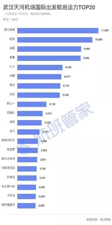 根据航班管家统计的12.30-1.22日武汉航班国内出发、国际出发、港澳台出发的运力数据,北京,广州,成都,海口,昆明,厦门,深圳,上海,三亚,南宁是武汉出港航班前10大城市。
