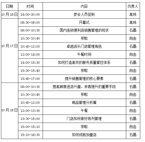 时间:10月17-18日 地点:四川-成都 主办单位:龙商网《超市周刊》《今日零售》杂志 针对业态:连锁便利店 授课对象:董事长、总经理、营运总监、采购总监、店长等相关管理人员 导读: 互联网时代下,我们不能与趋势为敌!面对强大的竞争与市场份额的逐渐萎...