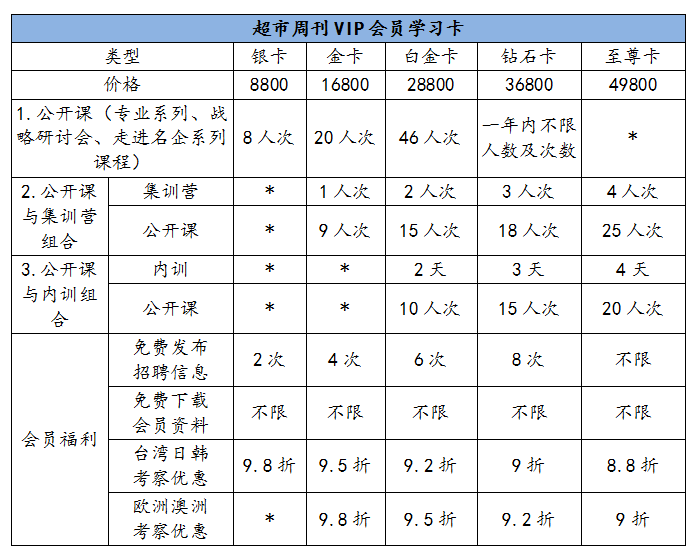 针对业态:超市、百货、便利店、药店、服饰、孕童、电器、酒店、餐饮授课对象:企业董事长、总经理、副总经理、财务、人力、营运、采购、店长及相关管理干部。(黄金组合:老板/总经理、1-2个店长、1-2个采购,现场学习现场演练,回企业马上落地)