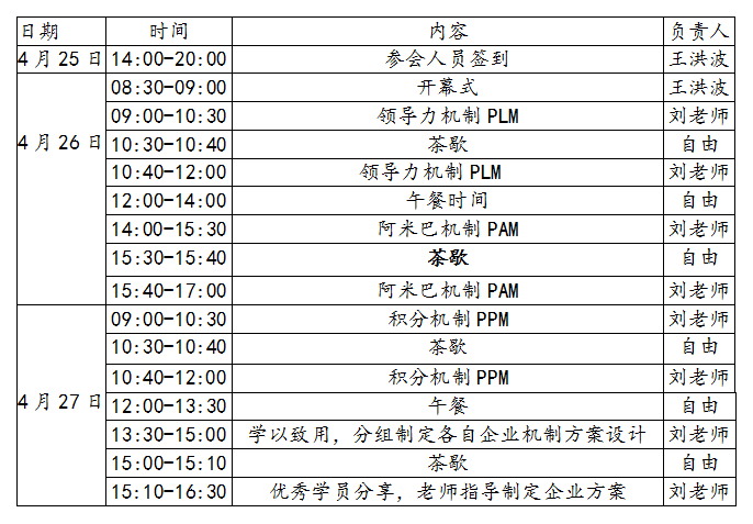 (2)优秀学员分享,老师修正调整,回炉总结,指导制定企业方案特别提醒:参加企业团队需带电脑,现场演练