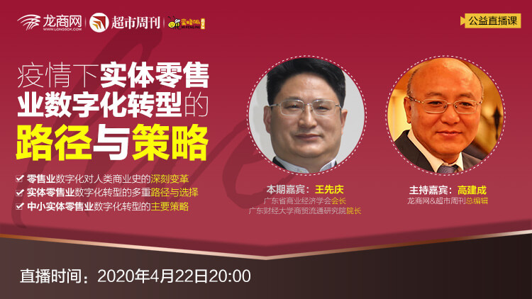 4月22日(周三)晚8:00,龙商网&超市周刊特邀广东省商业经济学会会长、广东财经大学商贸流通研究院院长王先庆与龙商网&超市周刊总编辑高建成就《疫情下,实体零售业数字化转型的路径与策略》展开深度访谈。敬请关注!