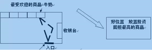 1)店内金三角——定位原则,它们在沿着三个要点的路径上:入口,收银台,店内被最频繁购买的商品周围。