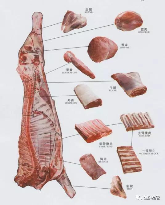 将标准的牛胴体二分体首先分割成臀腿肉、腹部肉、腰部肉、胸部肉、肋部肉、肩颈肉、前腿肉、后腿肉共八个部分。在此基础上再进一步分割成牛柳、西冷、眼肉、上脑、胸肉、腱子肉、腰肉、臀肉、膝圆、大米龙、小米龙、腹肉、嫩肩肉13块不同的肉块。
