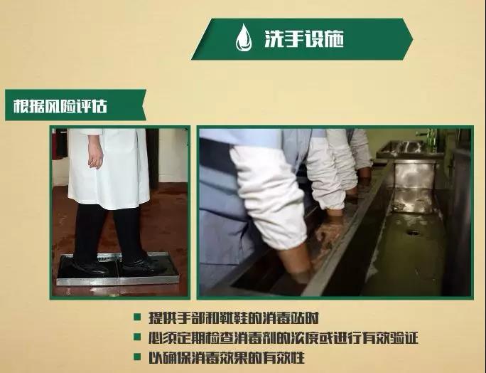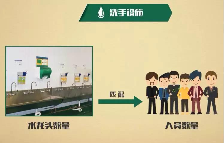 在生产区域的入口处、卫生间以及其它适当地点安装洗手设施,提供免手开龙头、适宜水温、洗手液、一次性纸巾或干手器等。