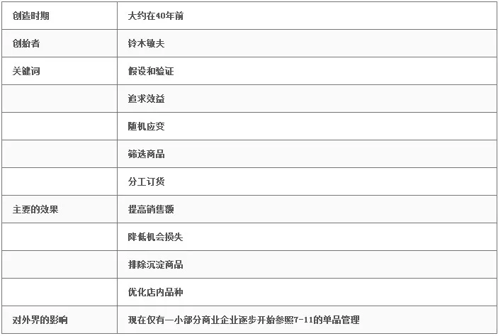 今天,7-11运用的单品管理,已经和当年的Unit Control不可同日而语。单品管理不再局限的定义为“管理的工具”,而是成为了“扩大销售的武器”。其“管理技巧”已经融入到了每个人的思想,“分析方法”进步成了“实践办法”。