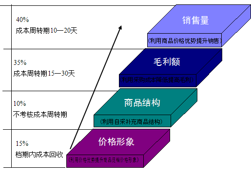 通过上述的表单我们可以看到,不同的商品自采它所占到的资金比例是多少,它的成本周转期考核指标是多少(自采商品的考核只能按照成本周转期来进行考核,而不能像目前某些企业那样来考核商品的销空周期)。