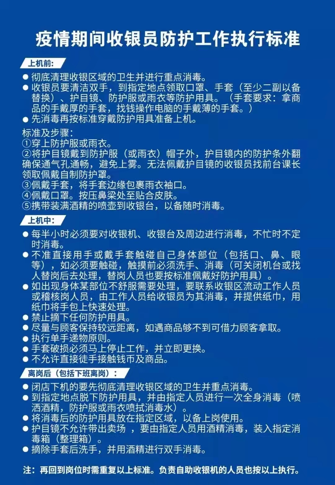 上机前: 彻底清理收银区域的卫生并进行重点消毒。 收银员要清洁双手,到指定地点领取口罩、手套(至少二副以备替换)、护目镜、防护服或雨衣等防护用具。(手套要求:拿商品的手戴厚的手套,找钱操作电脑的手戴薄的手套。) 先消毒再按标准穿戴防护用具准备上机。...