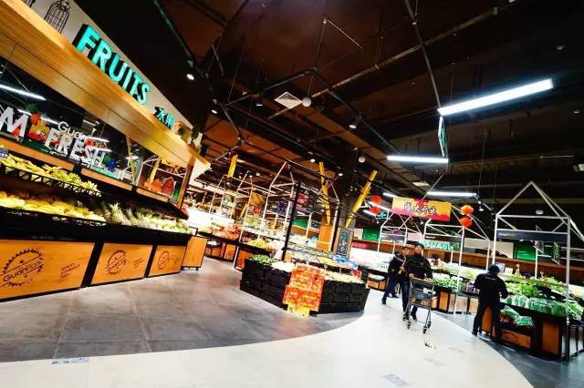 步入超市,映入眼帘的便是一条弧形的走道,两旁是一反传统的三角锥型的货架,上面陈列着琳琅满目的新鲜蔬果。货架上伸展出来的黄色“枝丫”,一只白色的冠雉轻巧灵动地栖息在上面,恰到好处地体现了GuanPark的公园式购物理念。