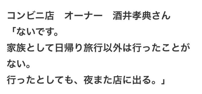全年无休啊,多么痛的领悟。作为便利店的经营者酒井孝典先生都十分无奈的吐槽到:“没有过全天休息,就算是和家人一起一日游的时间都没有。就算出去玩了,晚上也要回到店里。”连属于自己的时间都没有,全部贡献给小小的便利店了,真的很辛苦。