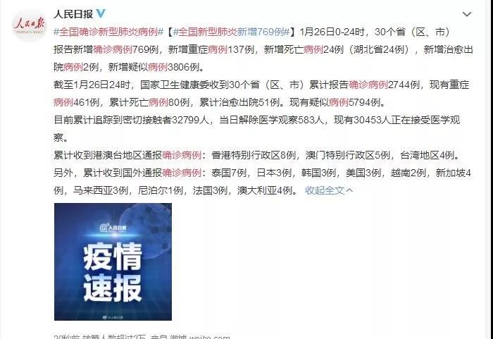 截至1月26日24时,国家卫生健康委收到30个省(区、市)累计报告确诊病例2744例,现有重症病例461例,累计死亡病例80例,累计治愈出院51例。现有疑似病例5794例。