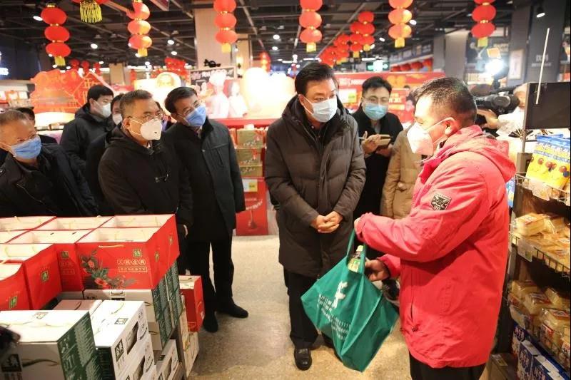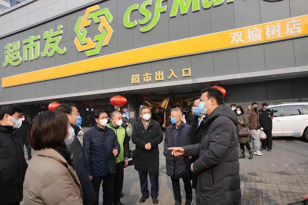 1月27日,北京市政协主席吉林、秘书长严力强一行来到超市发双榆树店,对春节期间日常用品和防控物资供应情况进行视察。海淀区委书记于军、区长曾劲、副区长张若冰、海淀置业集团总经理张建平、超市发董事长李燕川等领导陪同。超市发常务副经理赵萌、双榆树店店长刘学东作了随行介绍。