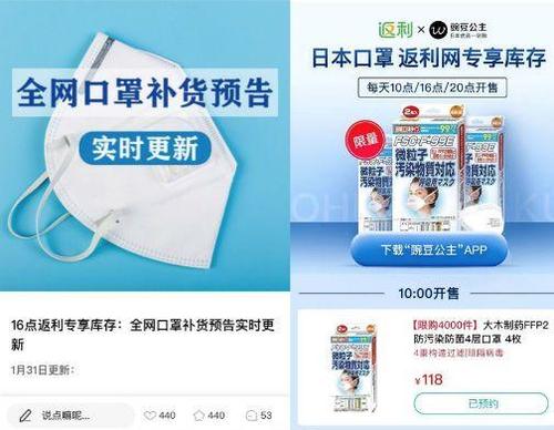 龙商网消息:1月30日,返利网上线”全网口罩绿色通道“,汇集了淘宝、京东、苏宁、小米有品、网易严选、国美等多个电商平台的口罩补货链接并实时更新,此外还联合跨境电商平台推出返利网专享库存的一批日本防护口罩。网友可直接登录返利App,点击进入专题,即可进行补货查询和定时购买。
