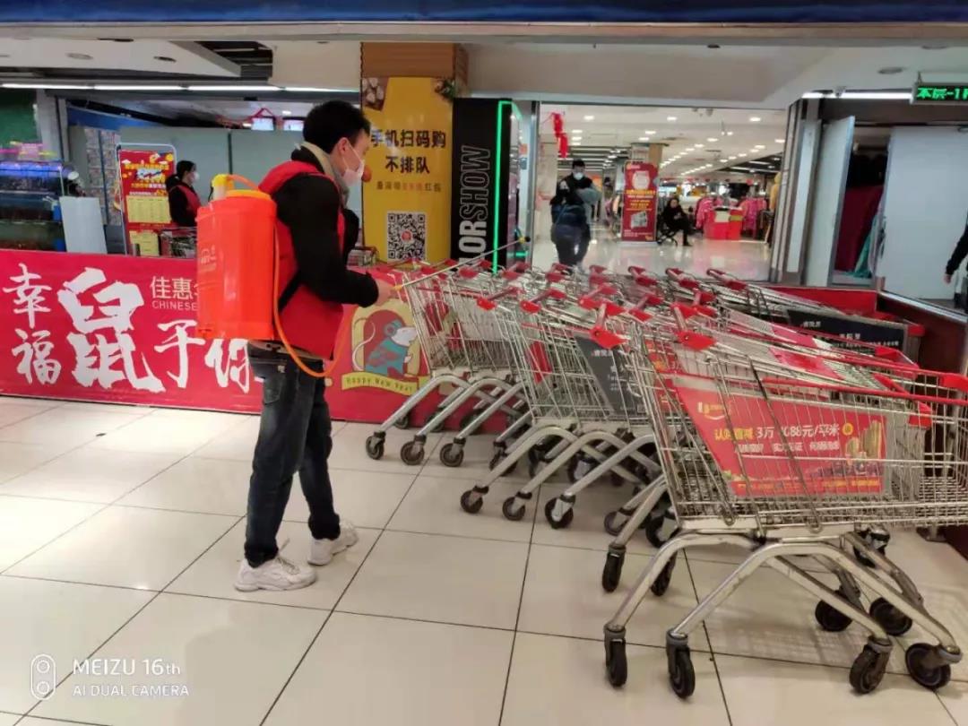 自己每隔3-4小时进行卖场、卫生间、垃圾桶、购物车、购物篮消毒工作。公司派发的口罩,每隔4小时给员工一一更换,换下来的口罩统一销毁,让员工上班期间感受到公司的关爱,也让顾客感觉进入超市的安全性。
