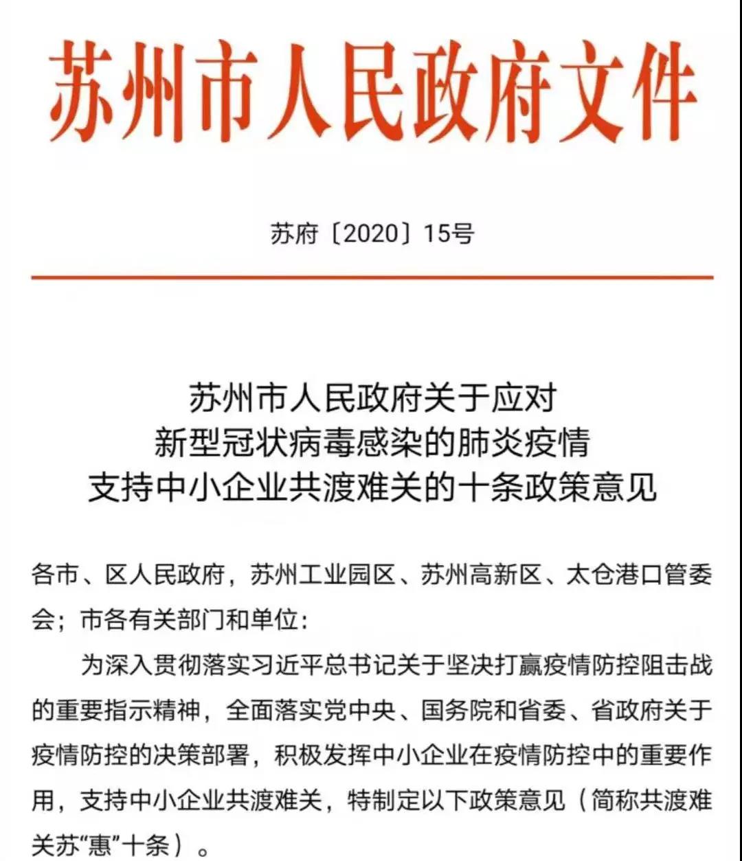 苏州市人民政府关于应对新型冠状病毒感染的肺炎疫情支持中小企业共渡难关的十条政策意见