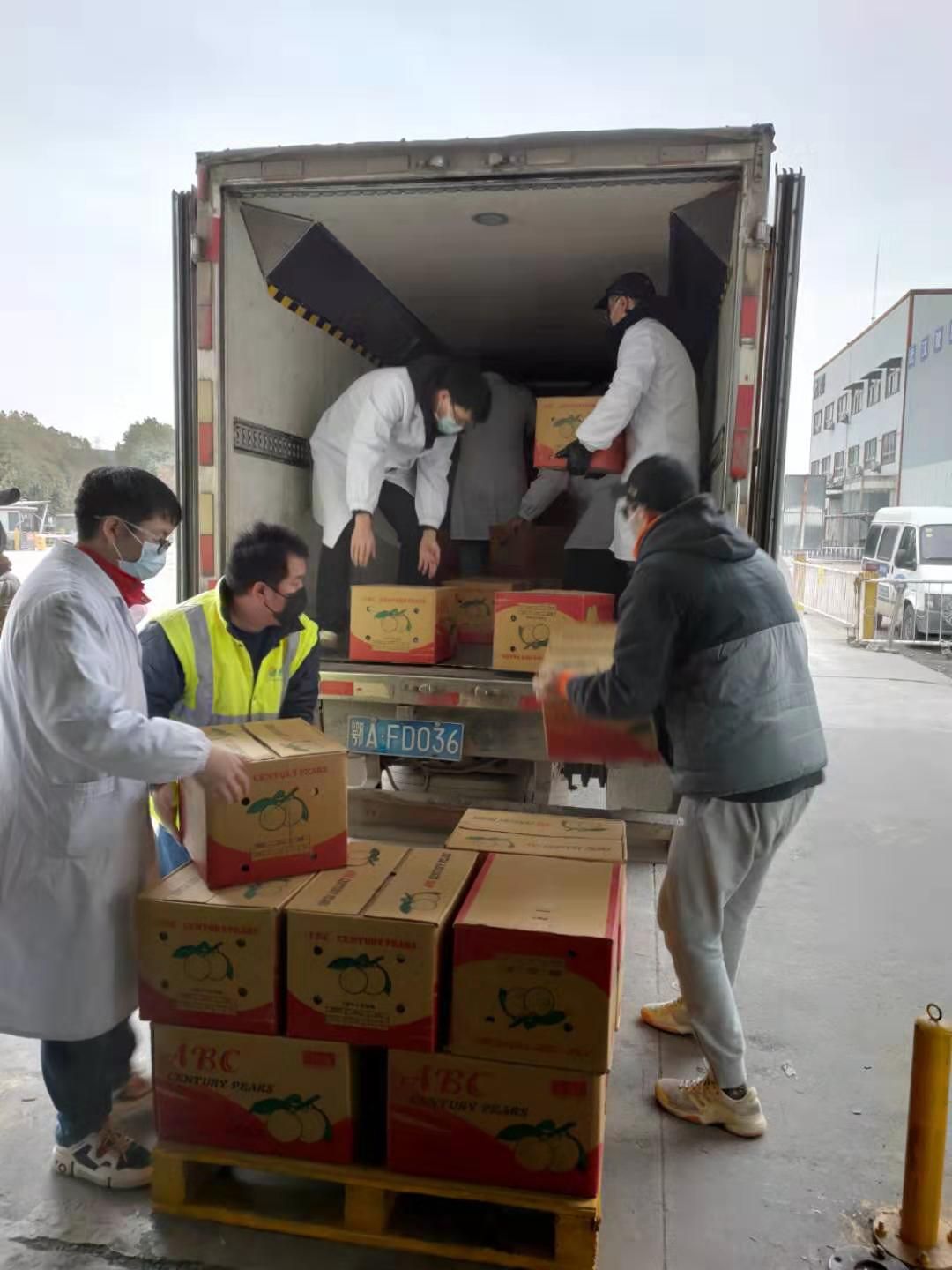 2月1日,由佳沃(青岛)果业有限公司拿出的300箱智利蓝莓、200箱河北皇冠梨、200箱脐橙、100箱智利车厘子送达武汉,交到了华中科技大学同济医学院附属协和医院、华中科技大学同济医学院附属同济医院,这两家医院的工作人员手中。